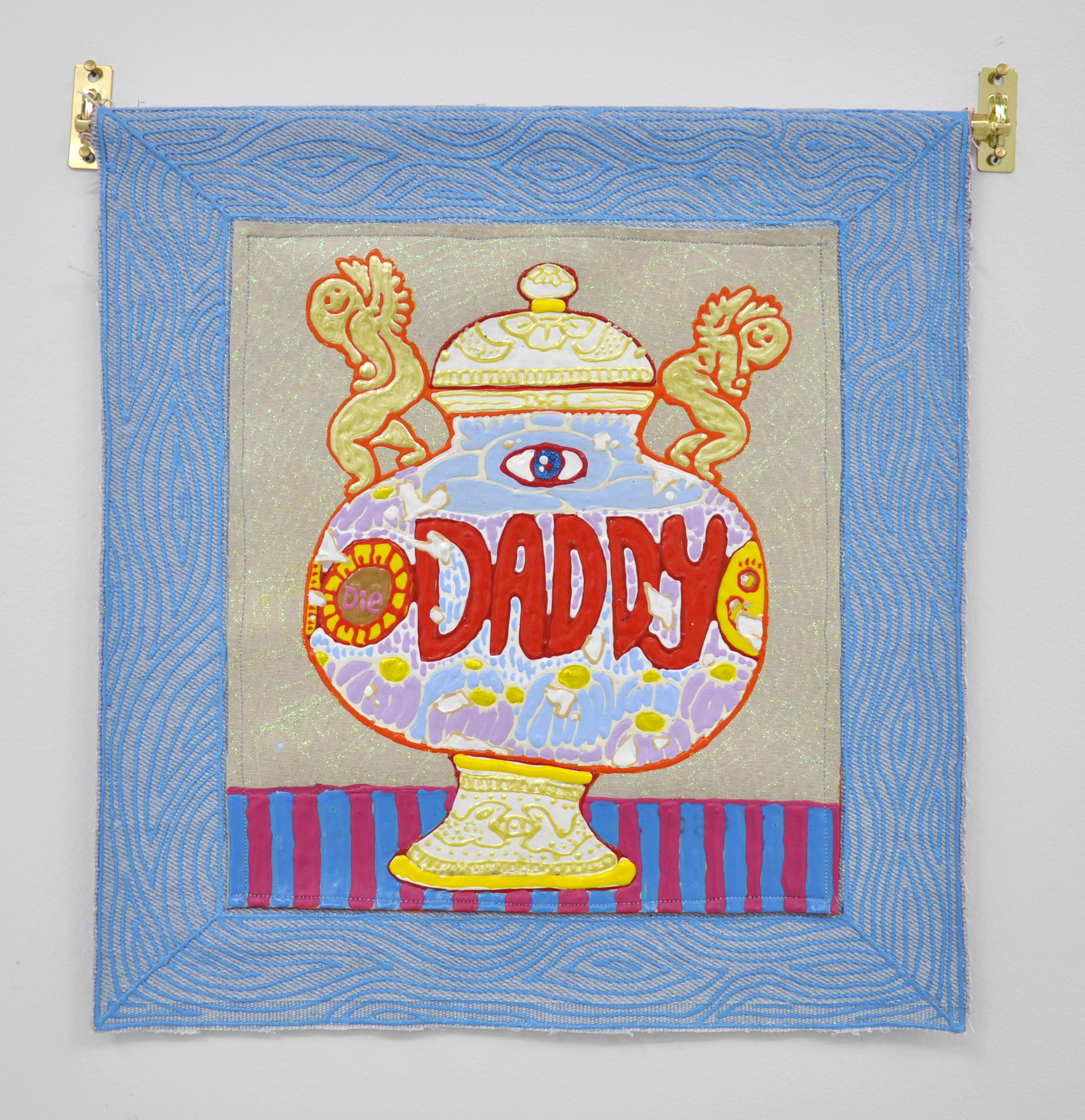 Craig Calderwood, "URN FOR DADDY", Dimensional Paint, Vinyl, Denim, Thread, 11.25” x 12”, 2019
