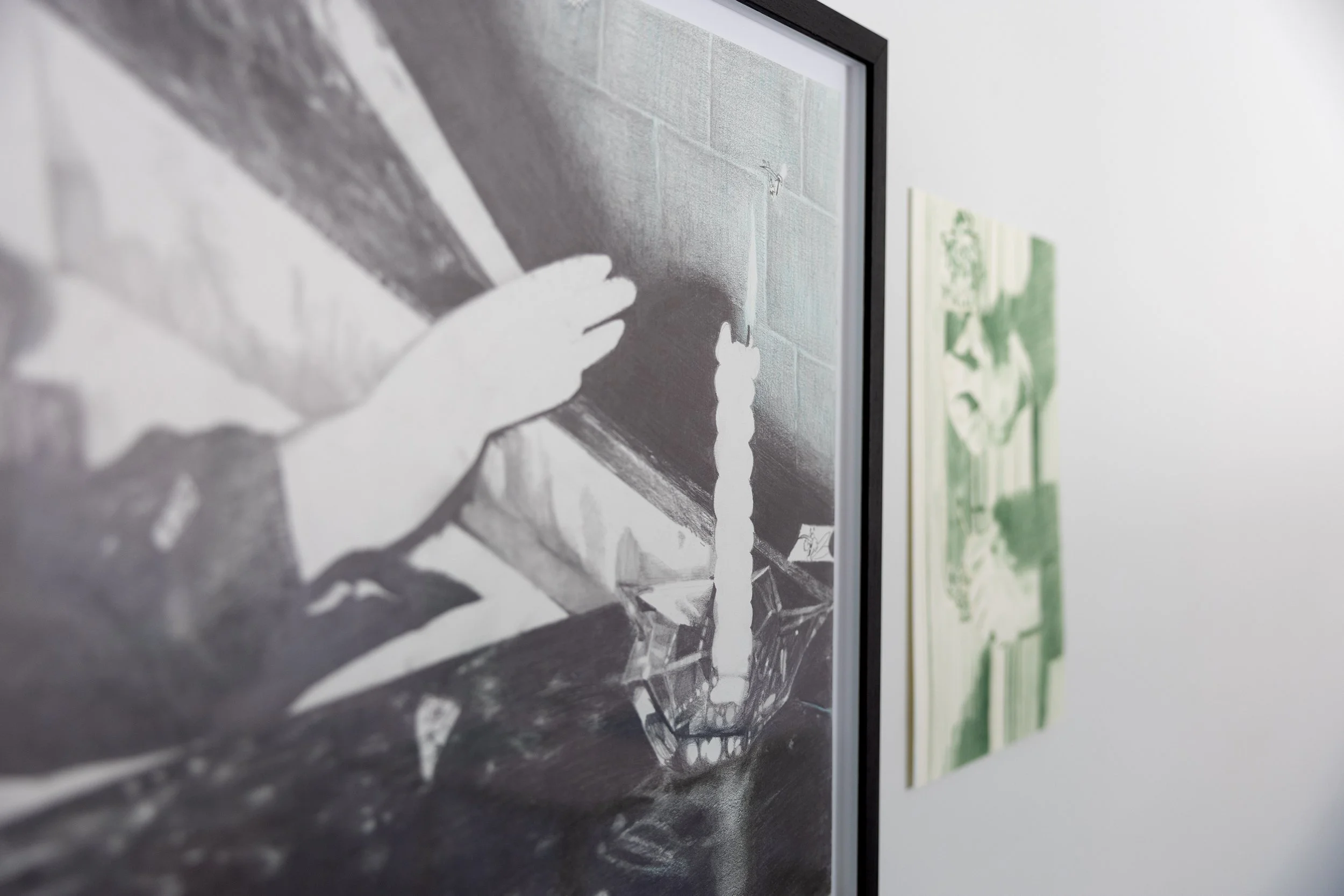 Similar to past bodies of work in which Alvarez depicted ways in which pixelated images slowly drew into focus on the internet, the artist employs a variety of means that deter and obscure an easy read of the images chosen. In velvet-crush, a wavy barcode-like overlay envelops the forms of two languid lovers. In miniscule power struggle, a fragmented comic of a doctor using a stethoscope creeps into a portrait of a young woman–hair cascading down over their face furthering the shrouding of appearances and a simple read.