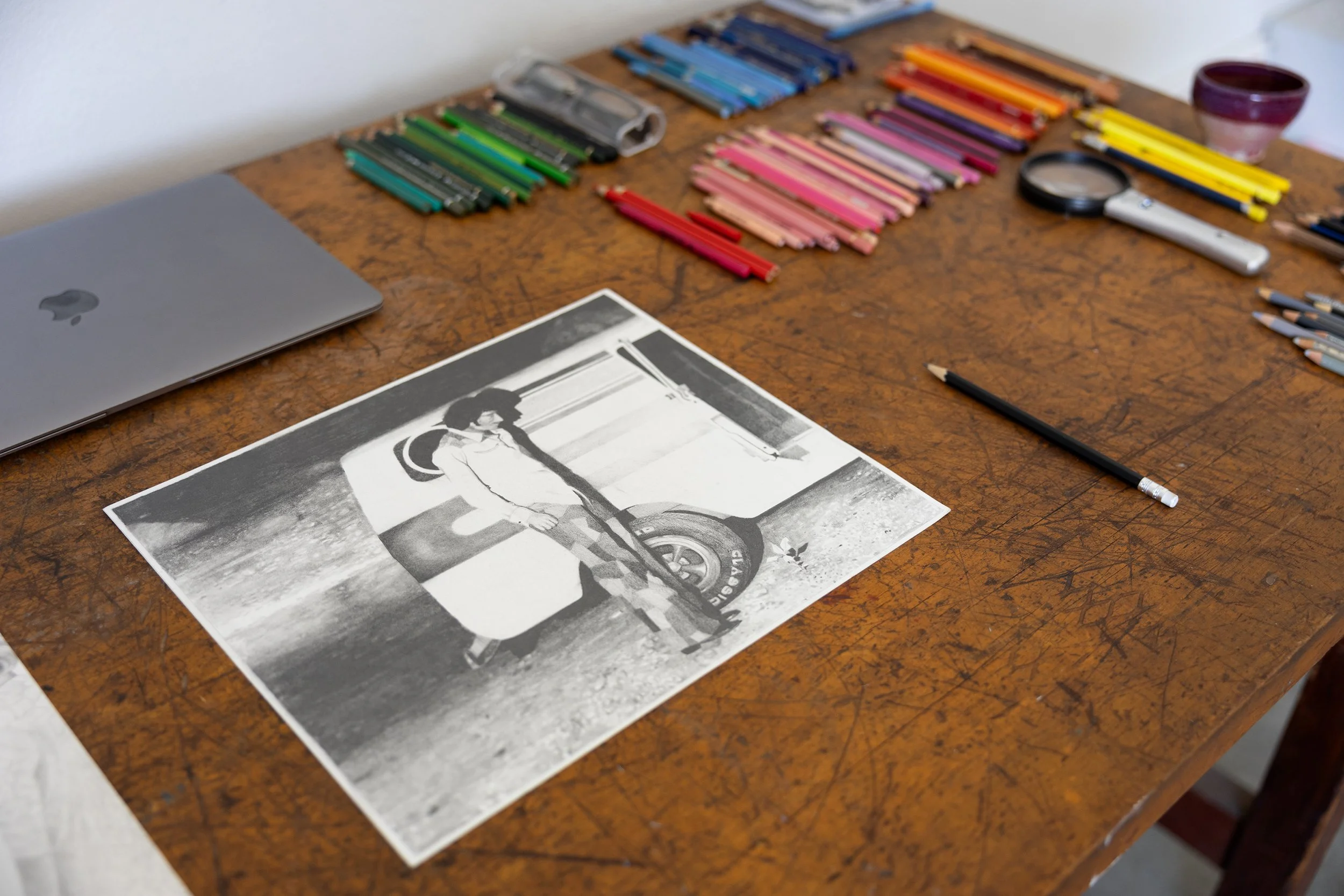 The use of yearbooks, a vehicle that instantly enshrines its content in a haze of warm nostalgia, serves as a compendium of already loaded source material for Alvarez. There is both a hyper-specificity to yearbooks, in that they reference very specific moments and inter-school dynamics to a small group of individuals, yet they also follow a set formula and are deeply relatable and understood by anyone that survived their high school years. The drawings within the exhibition also serve as an exploration of our concept of nostalgia in all of its facets. In one sense, nostalgia blankets any image with a rosy tint, yet we’re also struck with the pitfalls of this uncritical beckoning back to history as we think about the deliberately vague thesis of MAGA–which claims things were better once, without the need to specify when or for whom. In this sense, DL Alvarez’s Dormmagory is simultaneously an exploration of how we build and construct meaning through legibility, context, and relation, and an investigation into the ways in which we consume imagery and process it both consciously and subconsciously, as individuals, groups, and a collective society.