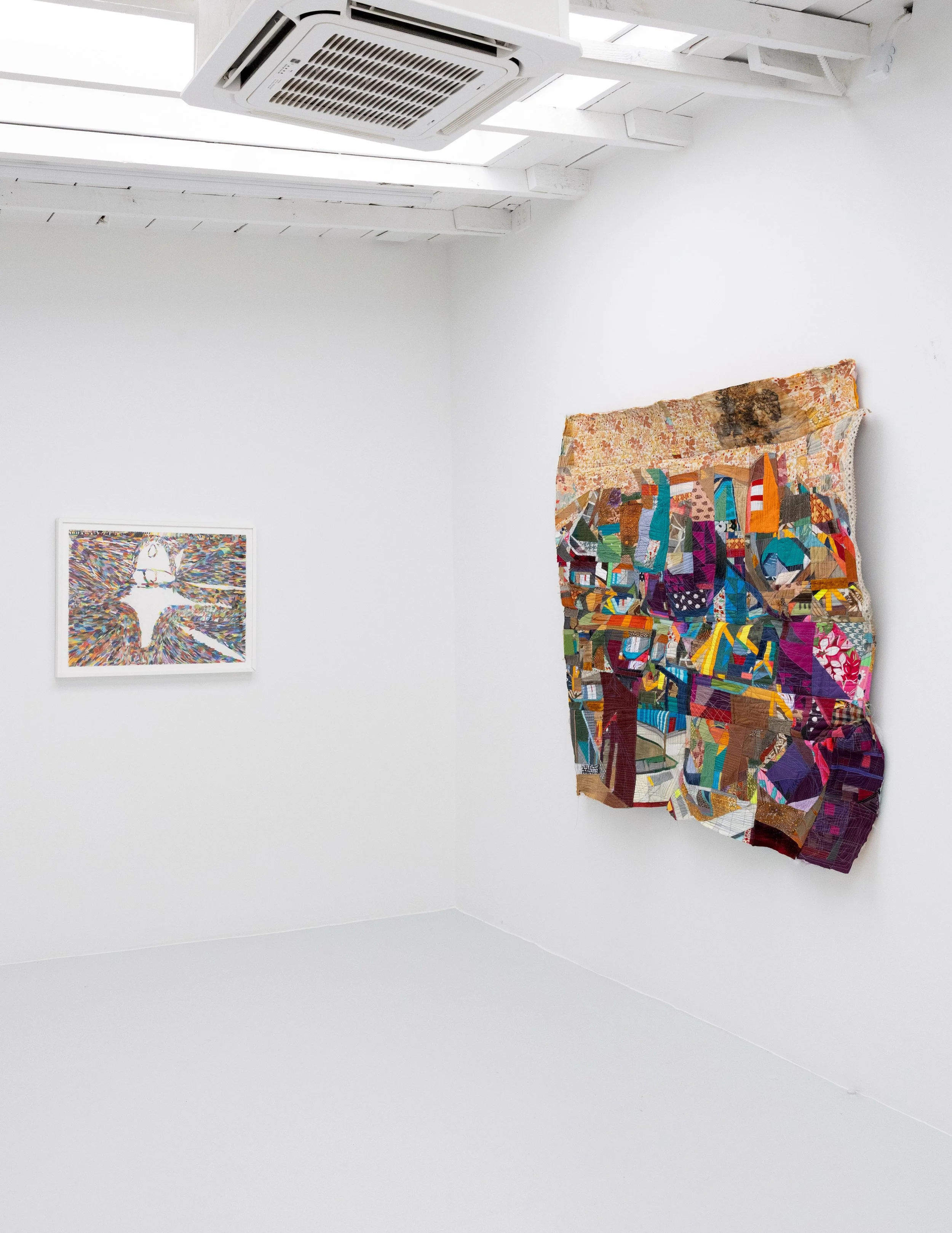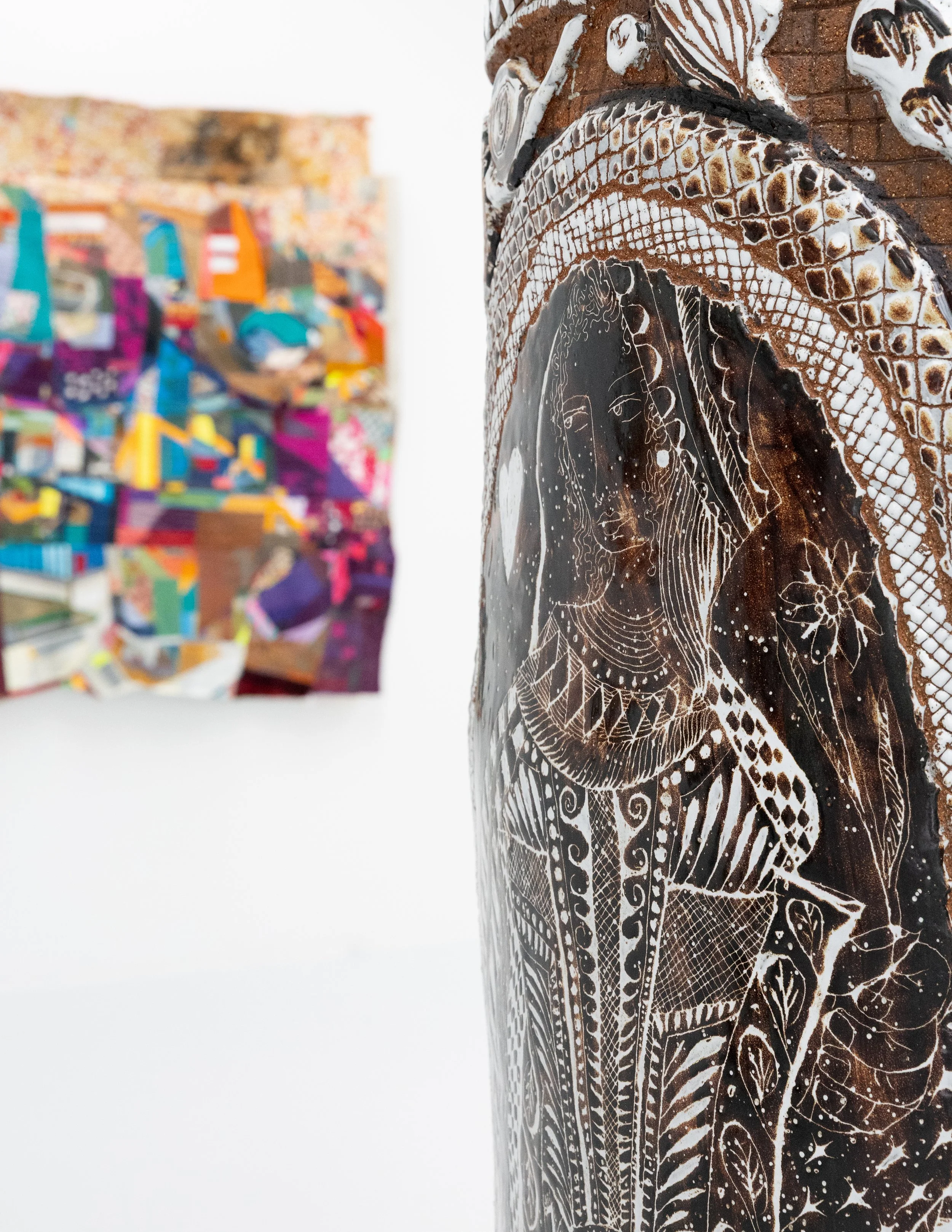 Works by Mansur Nurullah and Reniel Del Rosario on the other hand, are exercises in the practice of relinquishing control and letting go. Nuruallah’s richly textured and intensely layered quilted-pieces are a compendium of foraged fabrics, as well as the occasional scent element, batting and grommets, all held together through an obsessive pass upon pass of a Juki industrial sewing machine. Imbued with personal meaning and hidden narrative elements, Nurullah’s sculptural textiles revel in their maximal compositions, yet also operate as a therapeutic release for Nurullah after his days as a counselor in the San Francisco Unified School District working with suspended and expelled youth. Ceramic Dodgers hats by Reniel Del Rosario embrace the happy accidents and magic that only a 2000 degree firing can provide. Working with the artist’s voracious practice of recreating everyday objects in clay, Rosario takes full liberties with a litany of finishes upon the “Dodger Blue” caps, with dashes of white glaze splitting into small islands, or ancient rock-like growths sprouting from the vertical bar of the “L”. Alongside the rich mixture of glazes and time honored techniques that comprise Rosario’s “LA Hat 1 & 2”, the works also make perfectly clear our city’s greatest collective obsession–The Dodgers.