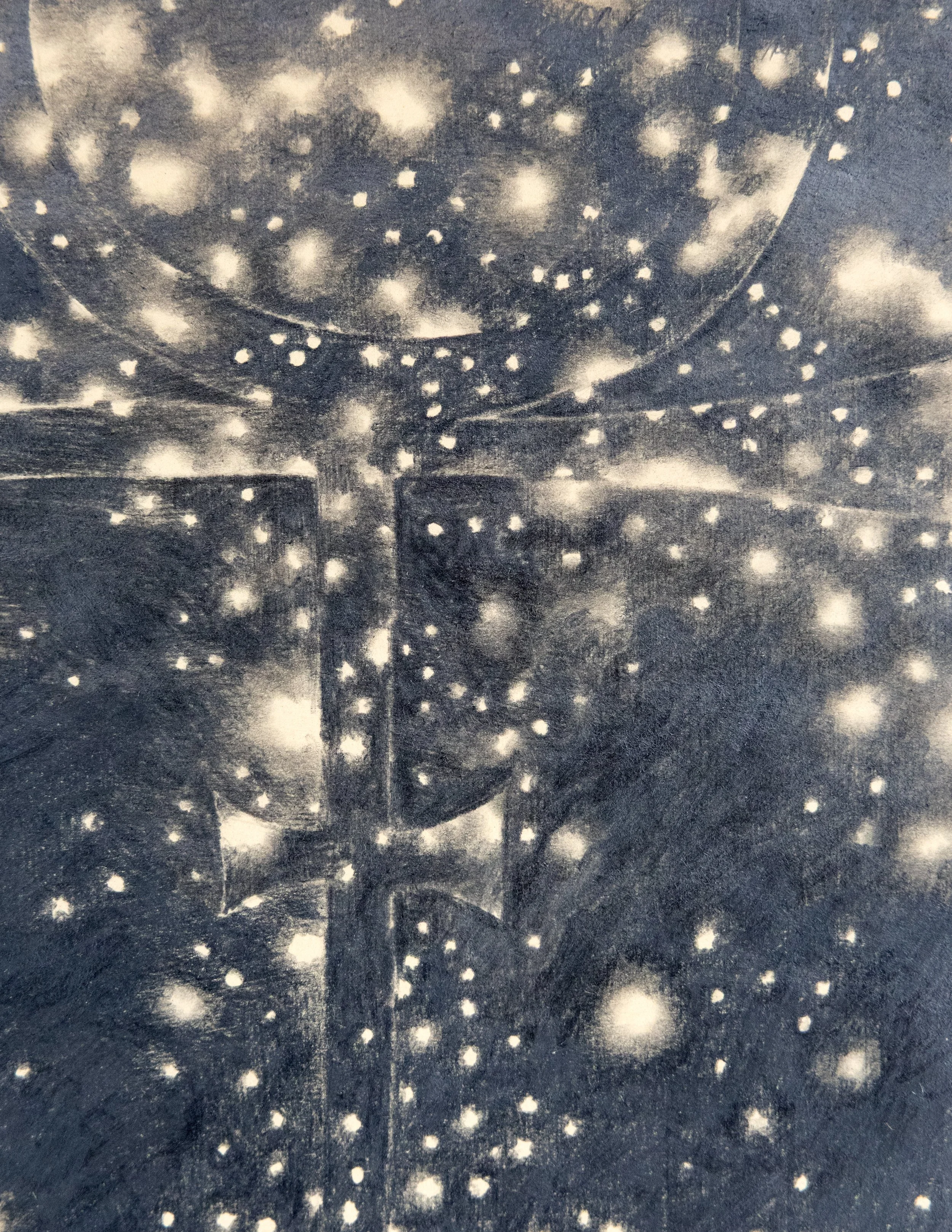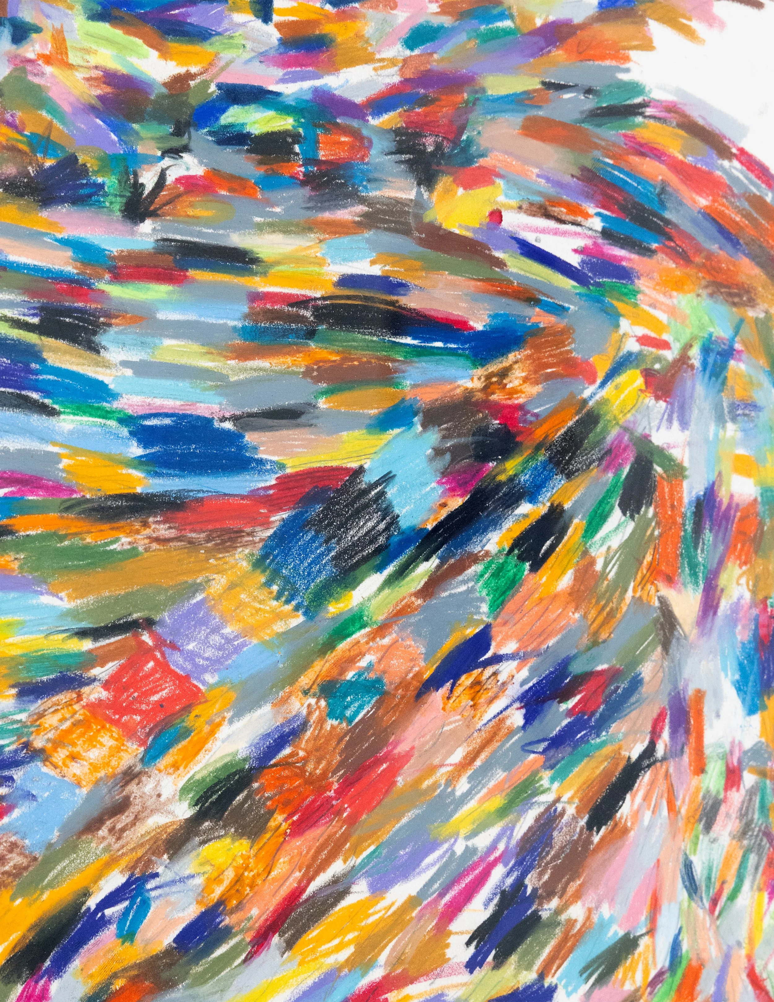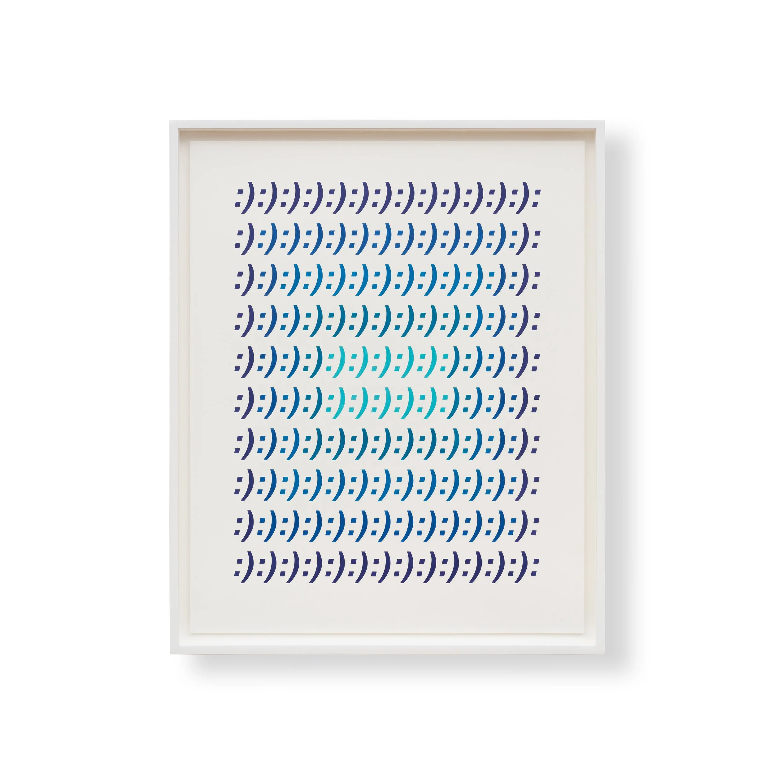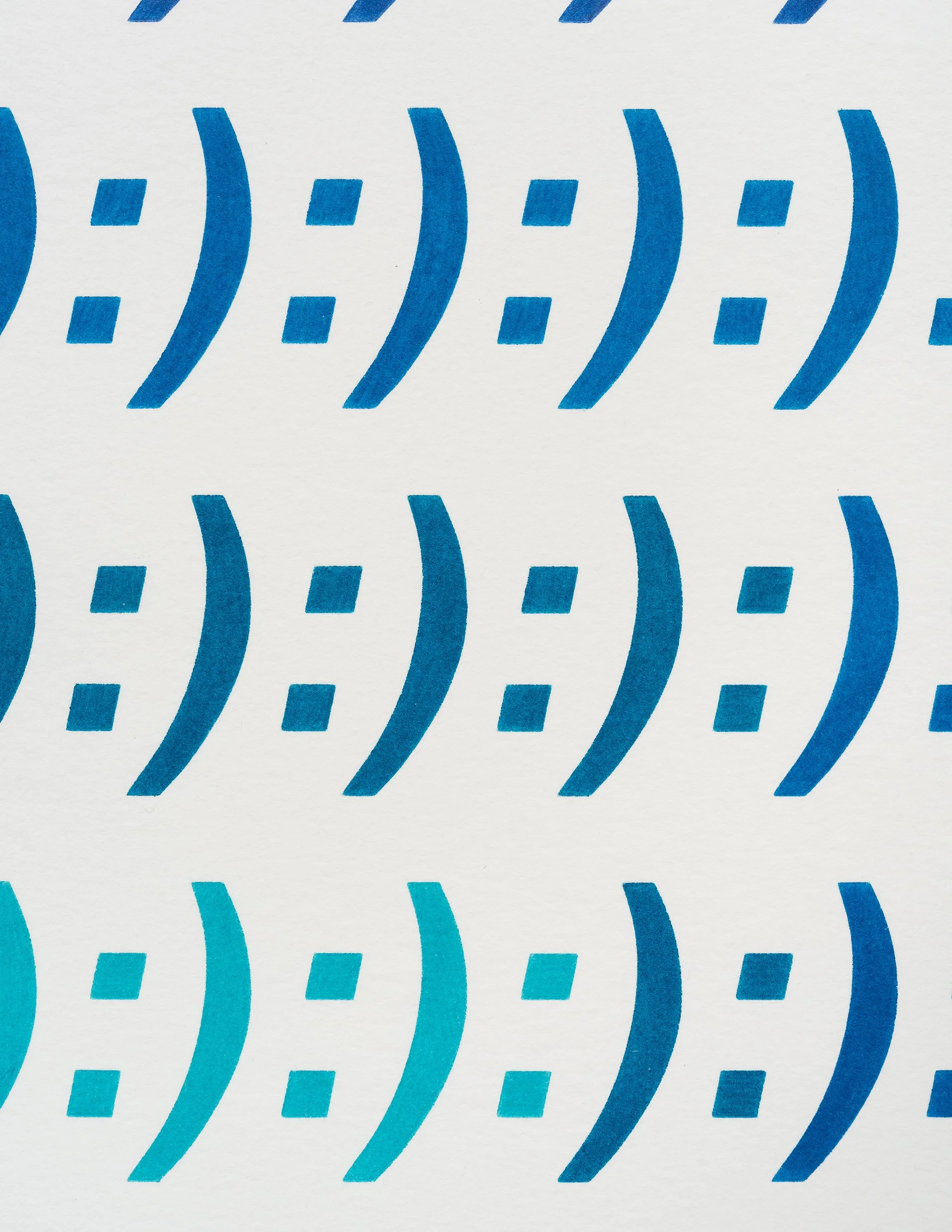 Sadie Barnette’s Typeface 5 creates a rhythmic composition composed of alternating italicized colon and right parentheses punctuation marks, creating 130 smiling or frowning emoticons in subtly shifting tones of blue colored pencil, from indigo to aqua and back. Barnette’s painstakingly analog drawing rendered in even fields of colored pencil shading feels digital in its precision, yet its employment of the smiley emoticons as a vestige of the early personal computer age in the 1980’s also speaks to our digital present, unpacking the ways in which artists today navigate the grey areas between IRL and virtual worlds. The sense of control evident in Barnette’s Typeface 5, resonates throughout the exhibition and surely our lives as well, as we struggle for control in various facets of our lives or become at peace with letting go. Kristen Morgin and Julio Del Rio like Barnette employ graphite or colored pencil, with Morgin realizing a hovering Prince “Love Symbol” amidst a starry universe backdrop, oscillating between moments of tightness and looseness, while speaking to the almost divine nature of the musician, and his legendarily obsessive musical and performance practice. Julio Del Rio, on the other hand creates a coursing field of colorful hatch marks of every possible color, layering and crashing into one another, leaving a mysterious field of white negative space in the middle of the composition that also bares some resemblance to Prince’s iconic symbol.
