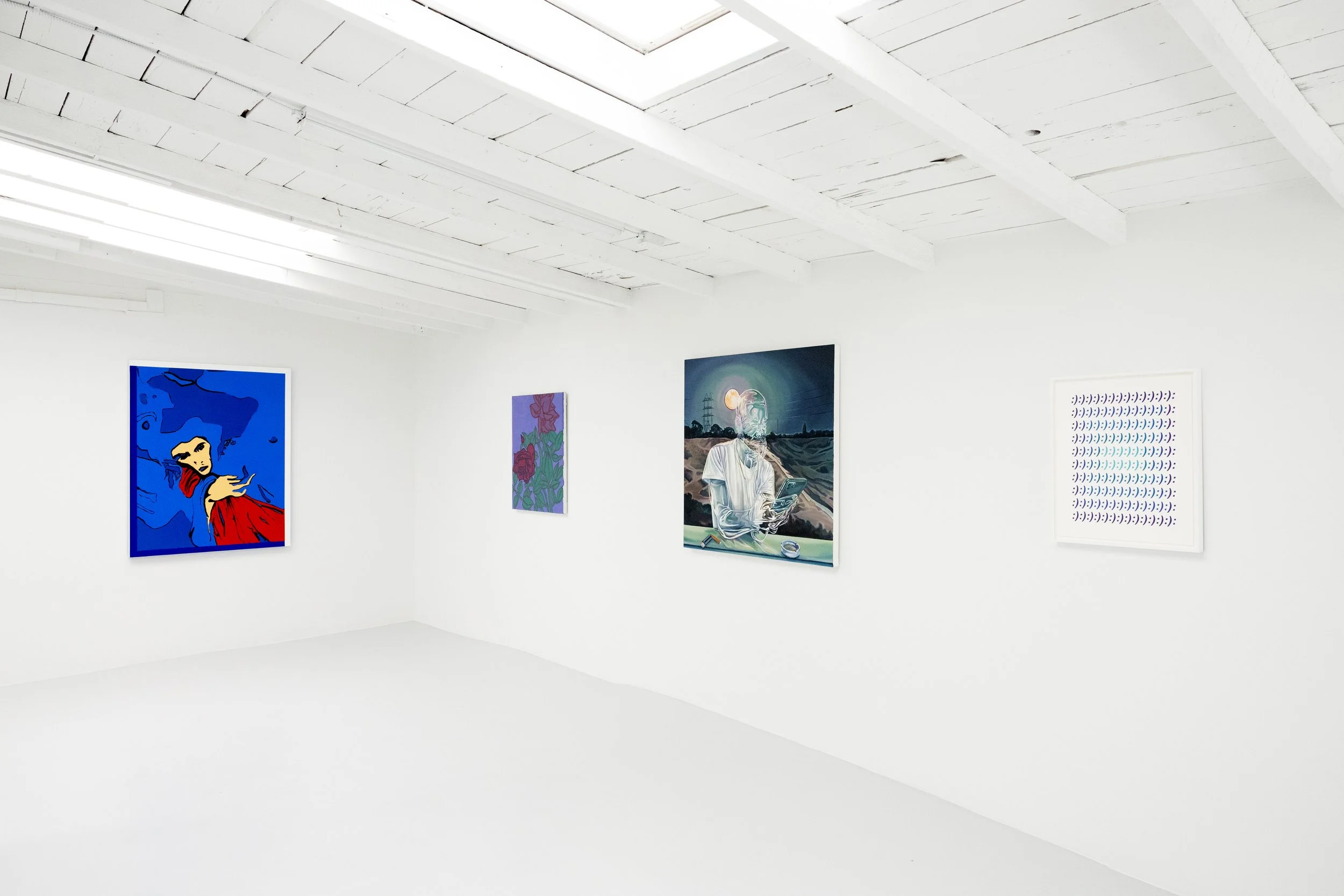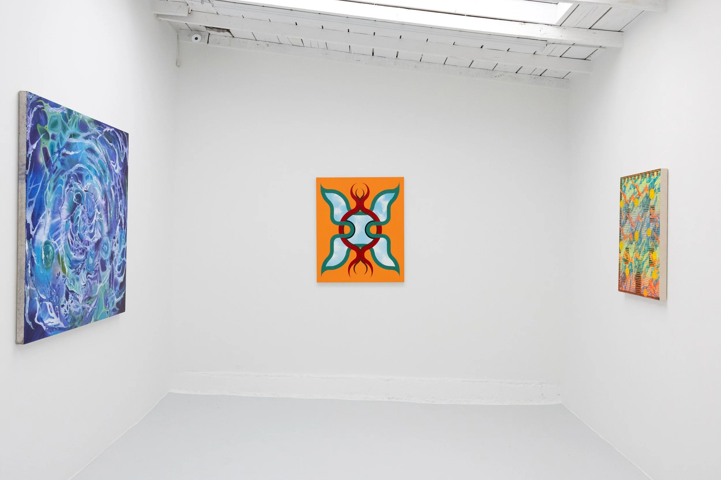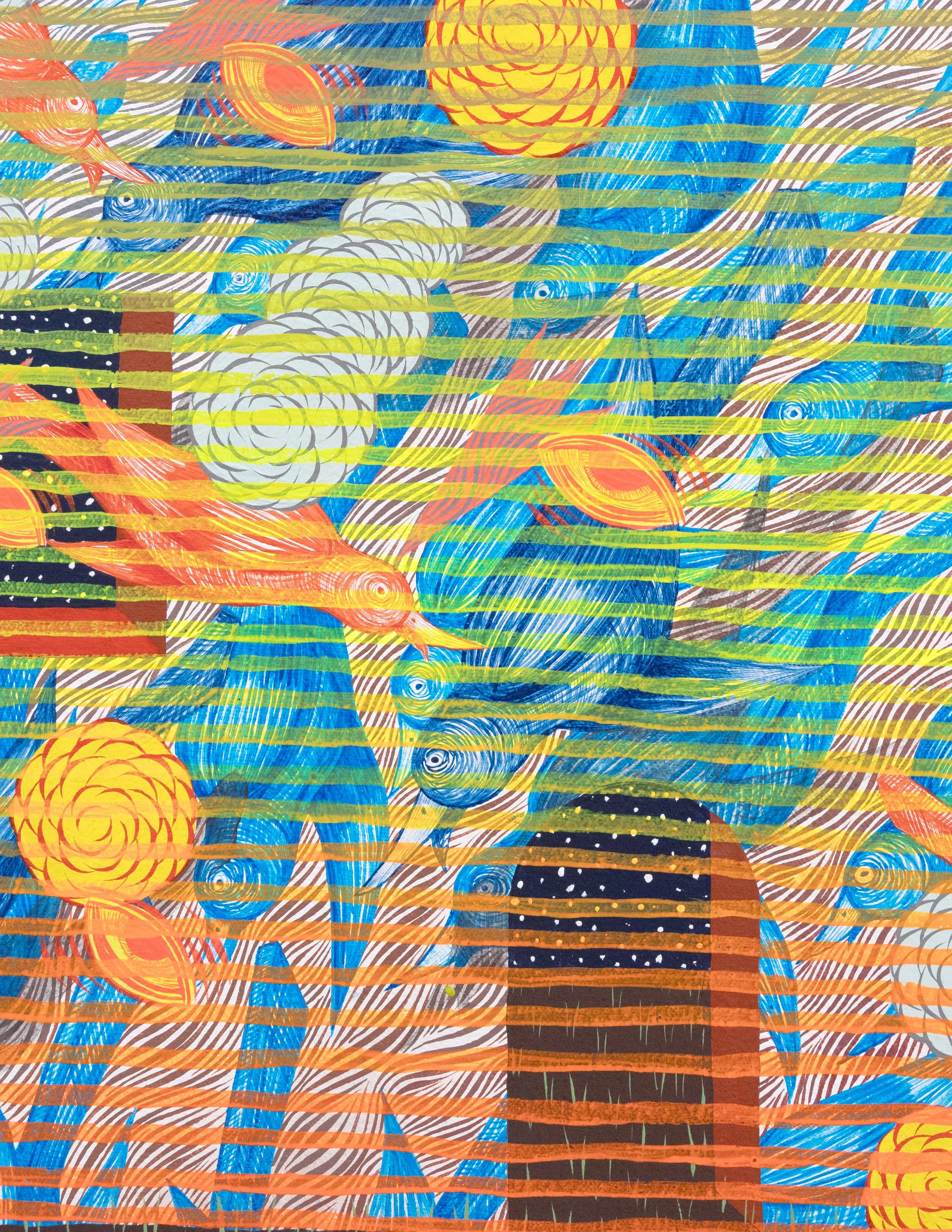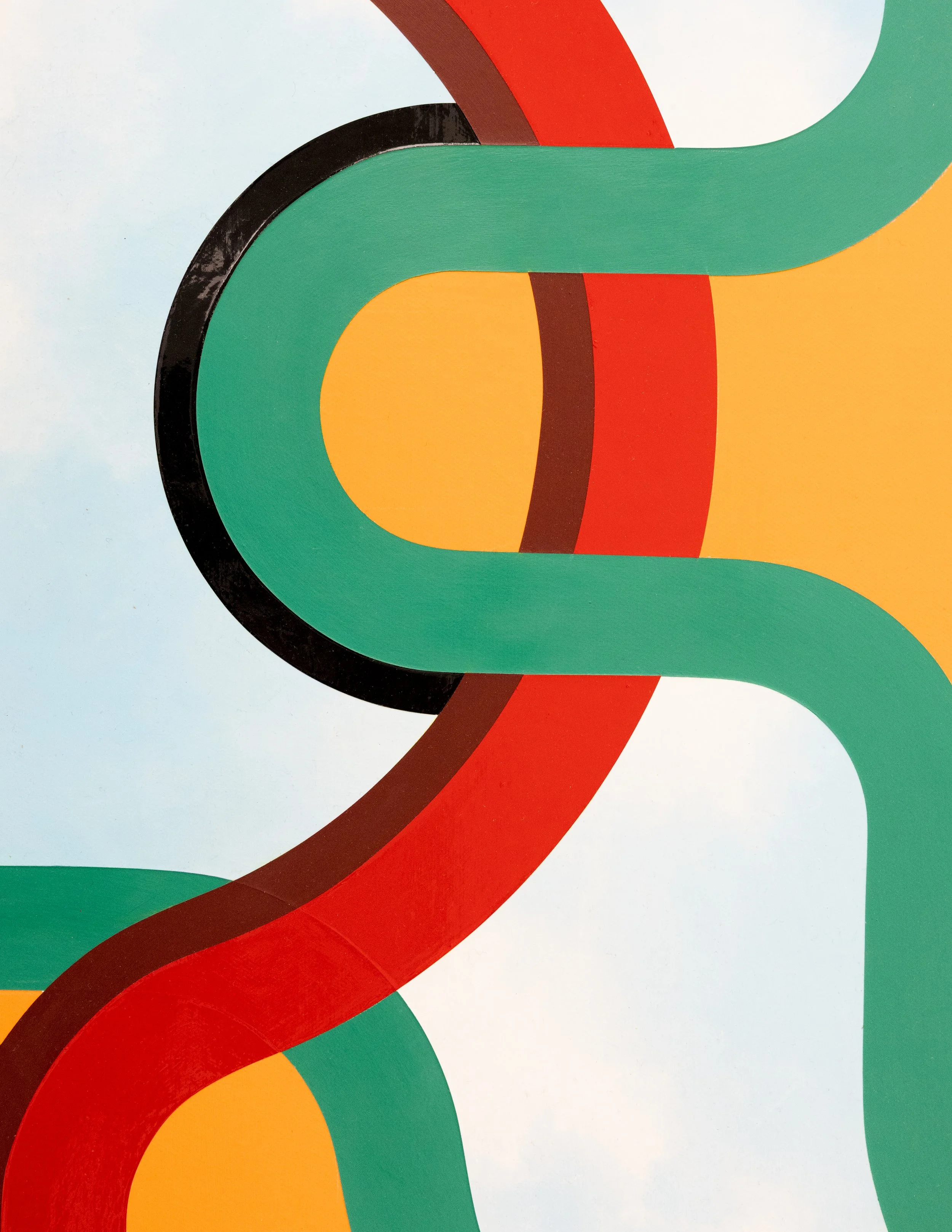 Sadie Barnette’s Typeface 5 creates a rhythmic composition composed of alternating italicized colon and right parentheses punctuation marks, creating 130 smiling or frowning emoticons in subtly shifting tones of blue colored pencil, from indigo to aqua and back. Barnette’s painstakingly analog drawing rendered in even fields of colored pencil shading feels digital in its precision, yet its employment of the smiley emoticons as a vestige of the early personal computer age in the 1980’s also speaks to our digital present, unpacking the ways in which artists today navigate the grey areas between IRL and virtual worlds. The sense of control evident in Barnette’s Typeface 5, resonates throughout the exhibition and surely our lives as well, as we struggle for control in various facets of our lives or become at peace with letting go. Kristen Morgin and Julio Del Rio like Barnette employ graphite or colored pencil, with Morgin realizing a hovering Prince “Love Symbol” amidst a starry universe backdrop, oscillating between moments of tightness and looseness, while speaking to the almost divine nature of the musician, and his legendarily obsessive musical and performance practice. Julio Del Rio, on the other hand creates a coursing field of colorful hatch marks of every possible color, layering and crashing into one another, leaving a mysterious field of white negative space in the middle of the composition that also bares some resemblance to Prince’s iconic symbol.