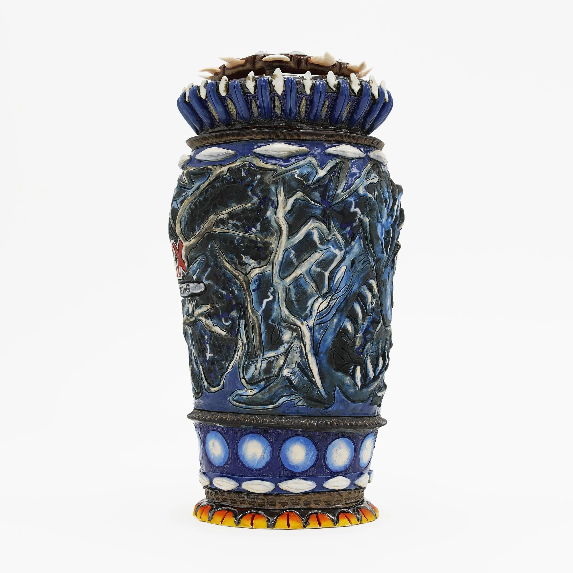 Jack Alving creates ceramics that collide disparate formal languages in a way that is so natural and convincing that it becomes difficult to pick apart where one reference point ends and the next begins. We see the ancient history of pottery smashed into the shouting text of gas station virility treatments or the sharp and boyishly militaristic aesthetics of large scale fireworks. The angular ornamentations of medieval reliquaries are enmeshed perfectly with the formal qualities of a mortar cannon, the words “doom box” emblazoned on the side in a relief font all glazed in a nuclear fade of colors. Alving’s expert handling of glaze and saturated color provides the artist’s forms with a deeply radiant finish which dazzles and furthers the viewer’s confusion in looking at these deeply layered objects. Furthering this conversation are the introduction of unexpected yet perfectly at home materials such as shark’s teeth which protrude from the rims and sides of vessels, circling in a rhythmic yet ominous fashion, or trompe l’oeil cowrie shells, each recalling the coveted necklace your classmate might bring home from their vacation to Maui in 1992.