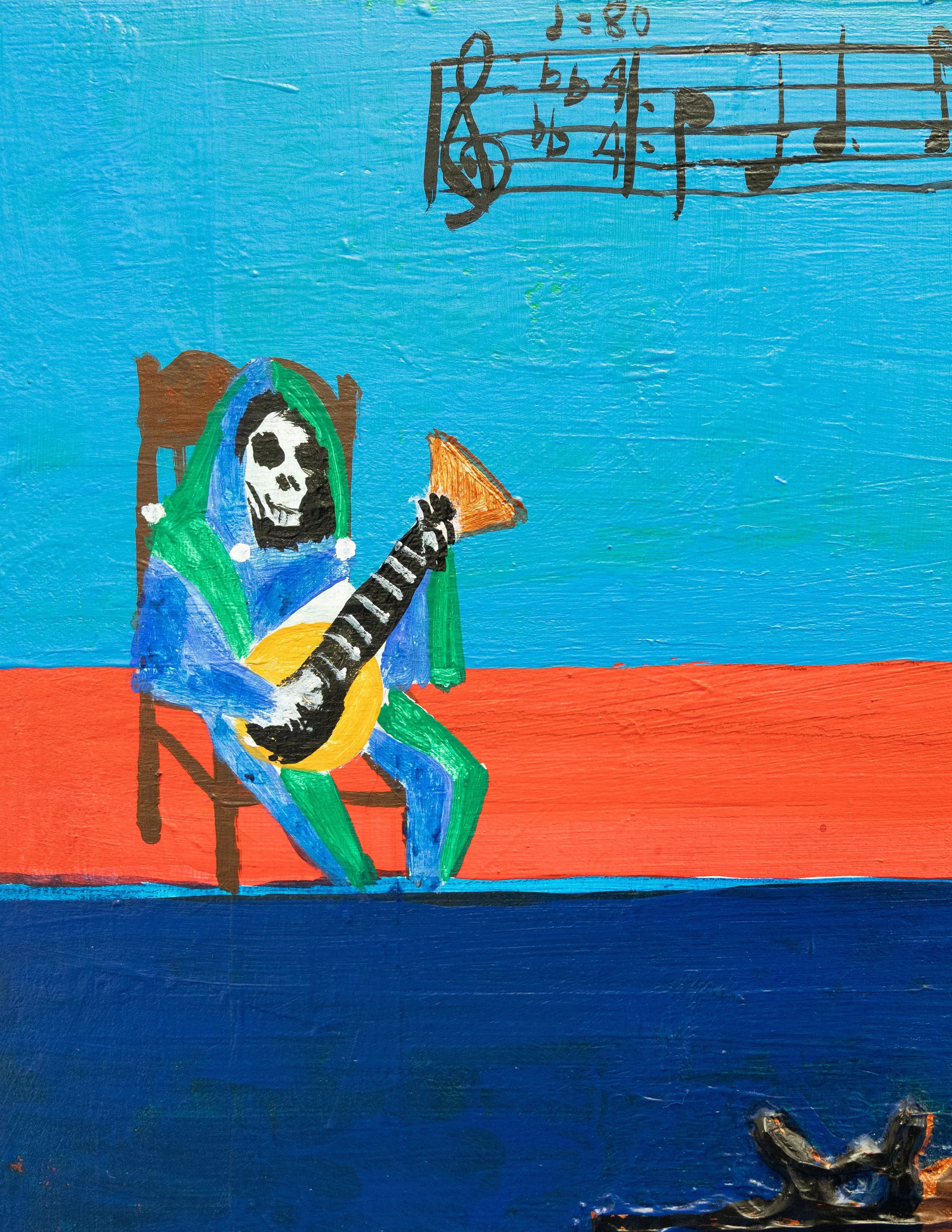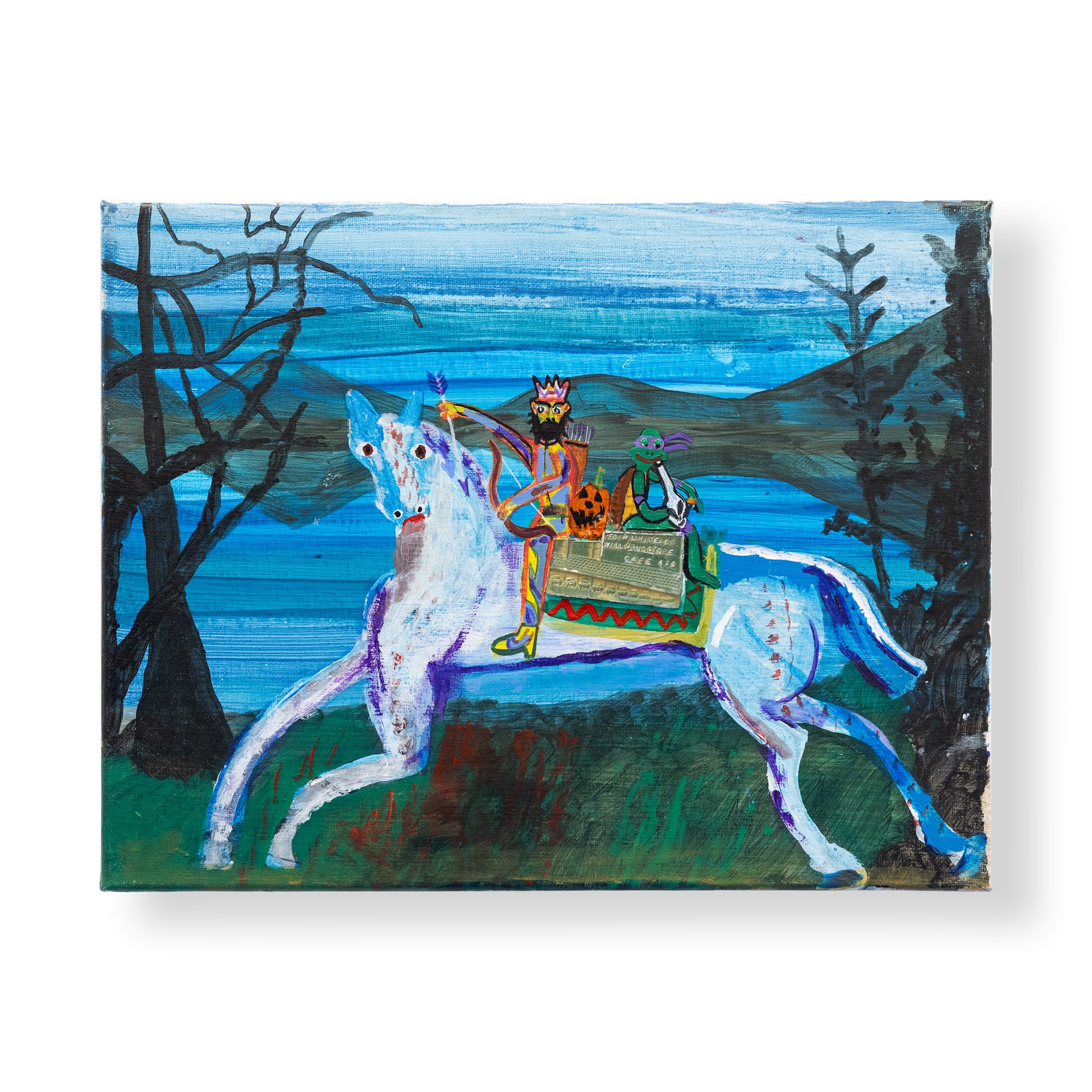 Coming inside from the bold wilderness, are a suite of still life works that utilize a repeating formula–angular confines of a colorful room with a receding table and an ever-changing series of confounding objects laid out that force the viewer to interpret and build a narrative. Painted on a piece of scrap plywood, Warp Whistle shows a crock pot and a Pyrex measuring cup, alongside a range of chemicals and a jar labeled “Mimosa Hostilis Root Bark”, the bark of a Brazilian tree that is used to synthesize the hallucinogen DMT. Breaking this somewhat real scene is a small rendering of a carefree Snoopy, next to plastic bottles, lying on his doghouse with Woodstock on his chest, a word bubble containing a snippet of music notation emanates, carrying another form of language ripe for interpretation. And while densely colored and symbolically rich, the still lifes within Oracle Dream Rot carry a sense of calmness and quiet, depicting nighttime with dark windows and lit cityscapes in the background. There’s a sense of being up when no one else is, which unsurprisingly is often the case with the artist’s studio time, finding space and calm after his partner, toddler and newborn have all drifted off to sleep.