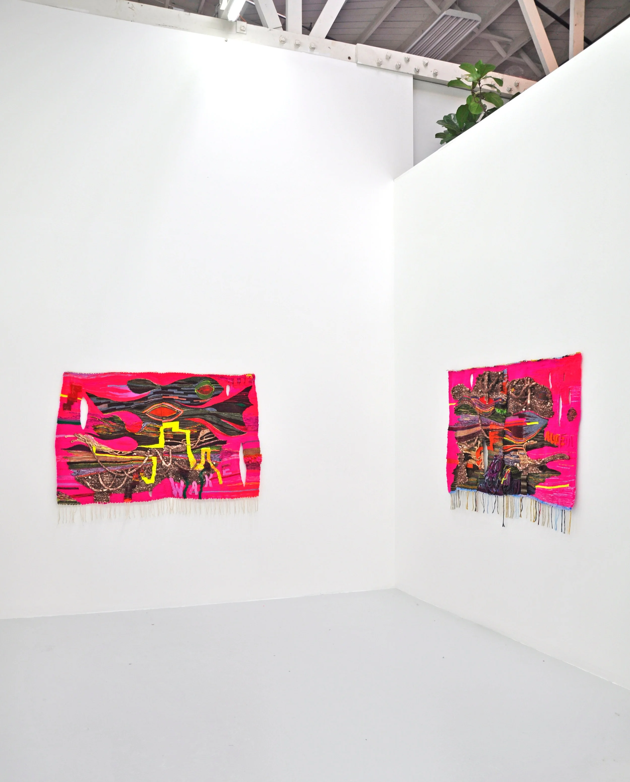 For years Friedman has explored color and the brain body connection through a wide variety of media from poured acrylic paintings, kinetic sculpture to temporary installations. Interested in the sickly sweet, awkward, uncertain, chromatic, theatrical, and ornate because it mirrors the unhinged world we live in and the vulnerable human experience. Both confrontational and comforting, color mirrors the unraveling and the renewal. The act of weaving itself is an act of unification of warp and weft, of left and right brain. Friedman is weaving new neural pathways in her brain and on her loom. The stained glass embedded into the dense tapestries cast shadows and add transparency or light through the cracks. They are purposefully complex, explosive, chromatic, and oxygenated. What fires together, wires together. So, the more we experience the anxiety and fear, the more we enforce our country’s neural pathways of hopelessness. Friedman is suggesting that one pathway out of the swamp is to not immerse ourselves in the mire of anxiety and consciously choose to rewire new pathways. The 2018 election is an example of action and brain rewiring that brought about a sea of change. Part of rewiring is action. Friedman’s work explores those places where politics and emotions intersect. Choosing to cultivate Positive brain chemistry as a response to agitation instead of being paralyzed by the enormity of the national destabilization is a way to rewire neural pathways and open up avenues of positive change and action.