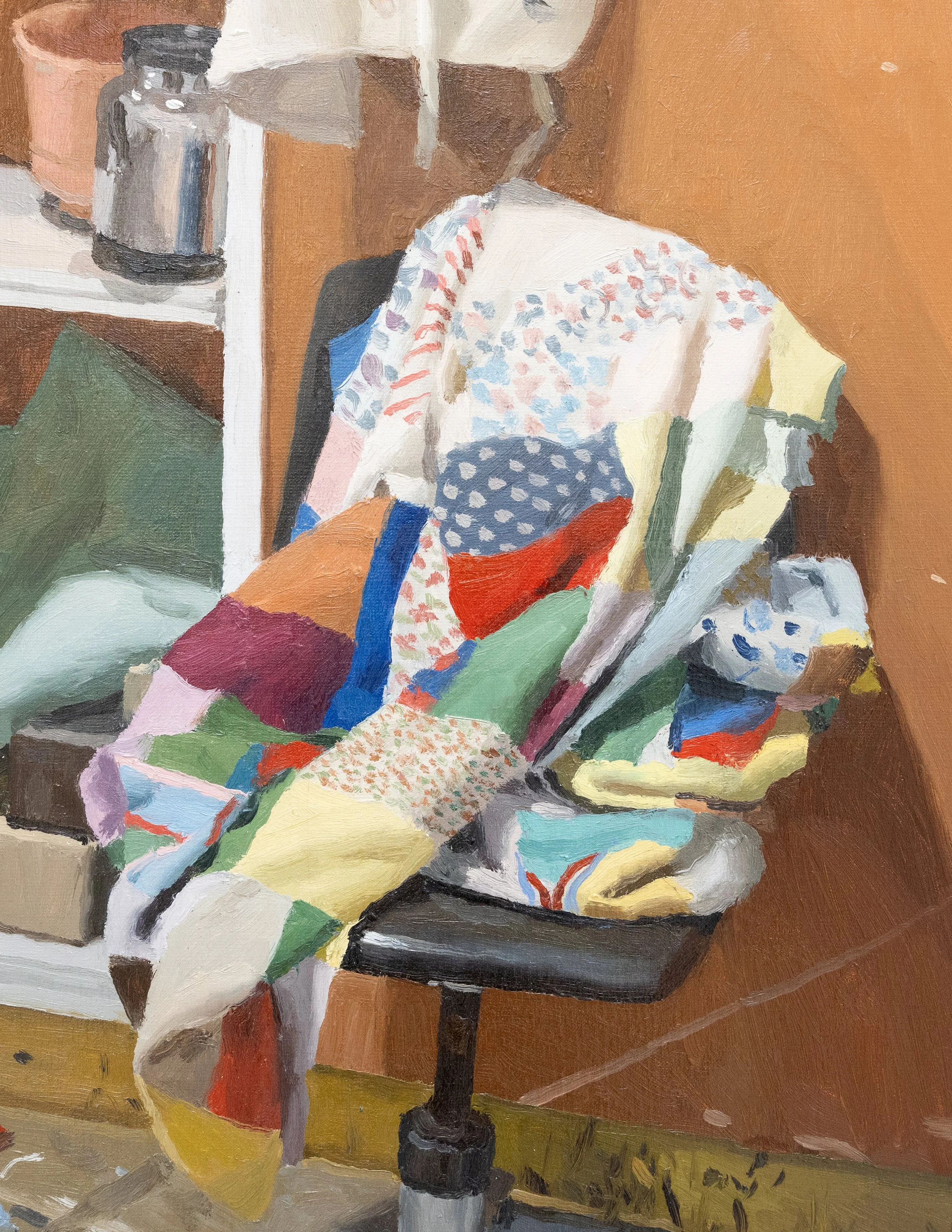 The works within Living Document depict still lifes composed within the artist’s home from everyday objects, or atop geometric textiles and handmade quilts, as well as outdoor scenes such as train trestles or the elaborate mechanical componentry of a semi-truck. Within these works Powers attests to a new-found patience within his painting process–a sense of calm in working slower and letting things take as long as they need while also realizing that he can never get something totally right. A quiet confidence permeates Powers’ latest works as he tackles dizzyingly complex textiles within his largest works, capturing the fleeting reflections and refractions of a densely tiled geometric textile as seen through a jug filled with water. Or within another painting of a train trestle we see the glowing gradations of receding wooden railroad ties, as these same colors bounce off the dappled stream and abound in the dense foliage behind. Powers renders these scenes with a warmth and intimacy that makes the unfamiliar instantly familiar, and as great painters have the capacity to do, prompts the viewer to look at their own objects and surroundings with a different sense of care and consideration.