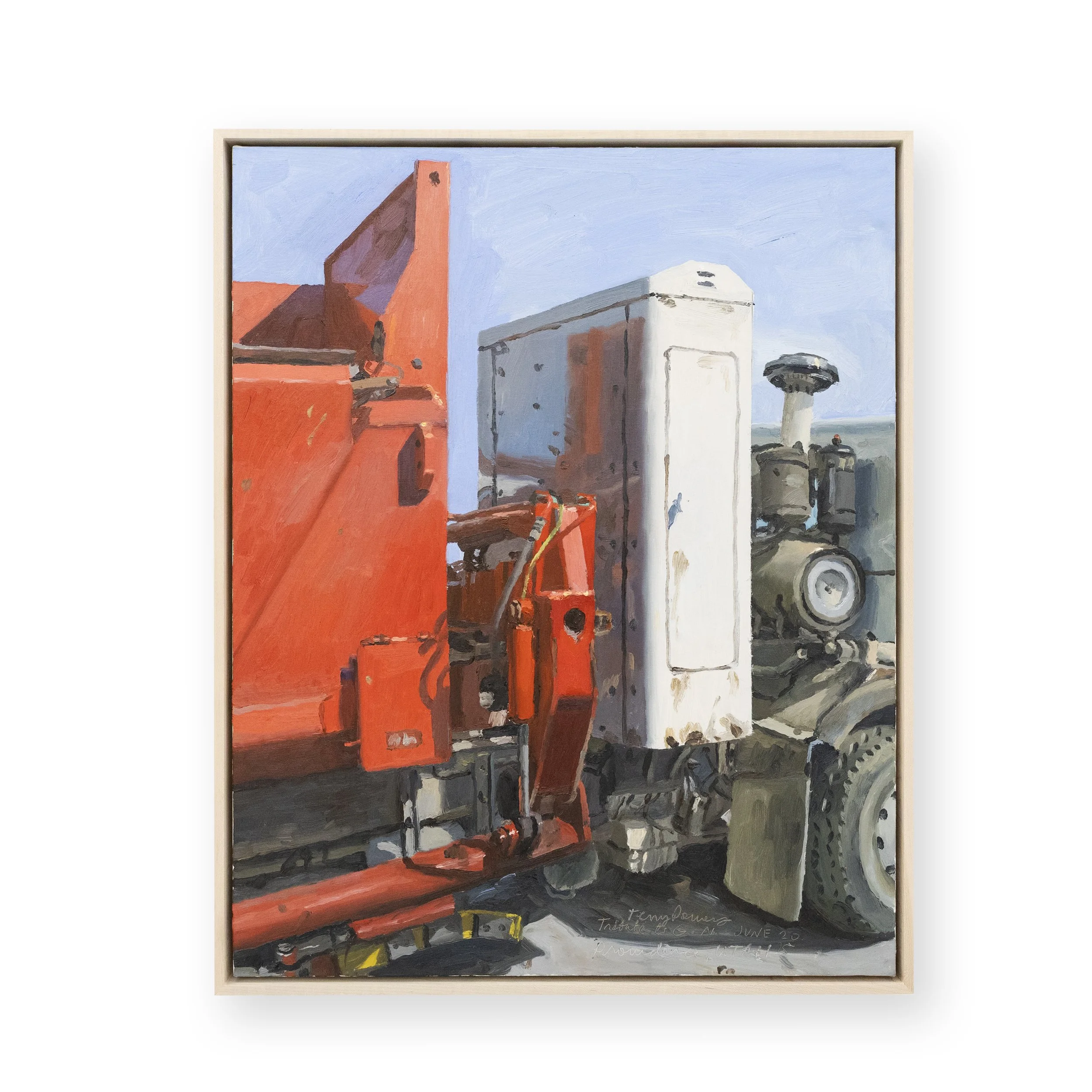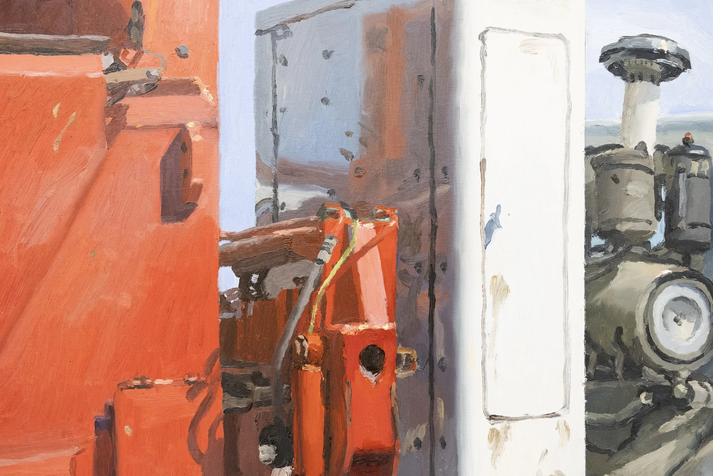 Powers describes the process of creating a painting as something akin to a stake-out. Any potential scene, or arrangement of objects, swath of fabric, or industrial backdrop has the potential to become a painting, yet Powers will observe these same settings multiple times over the course of the day, diagnosing how light plays and shadows are cast. Refusing the urge to photograph these scenes so as not to see them as images before an easel is set up, once the painting is started, outside circumstances such as weather, lighting shifts or the demands of a busy work and family schedule all play into the outcome of each work. Following the artist’s move from the Bay Area to northern Utah to join the painting faculty at Utah State University, a new element of seasonality has begun to play into the work. Dictated by the fluctuations of a harsher climate, smaller paintings are made in the winter, painted predominantly in the early morning or in stretches before picking up kids, while larger paintings are painted outdoors in the summer when time is less pressed.