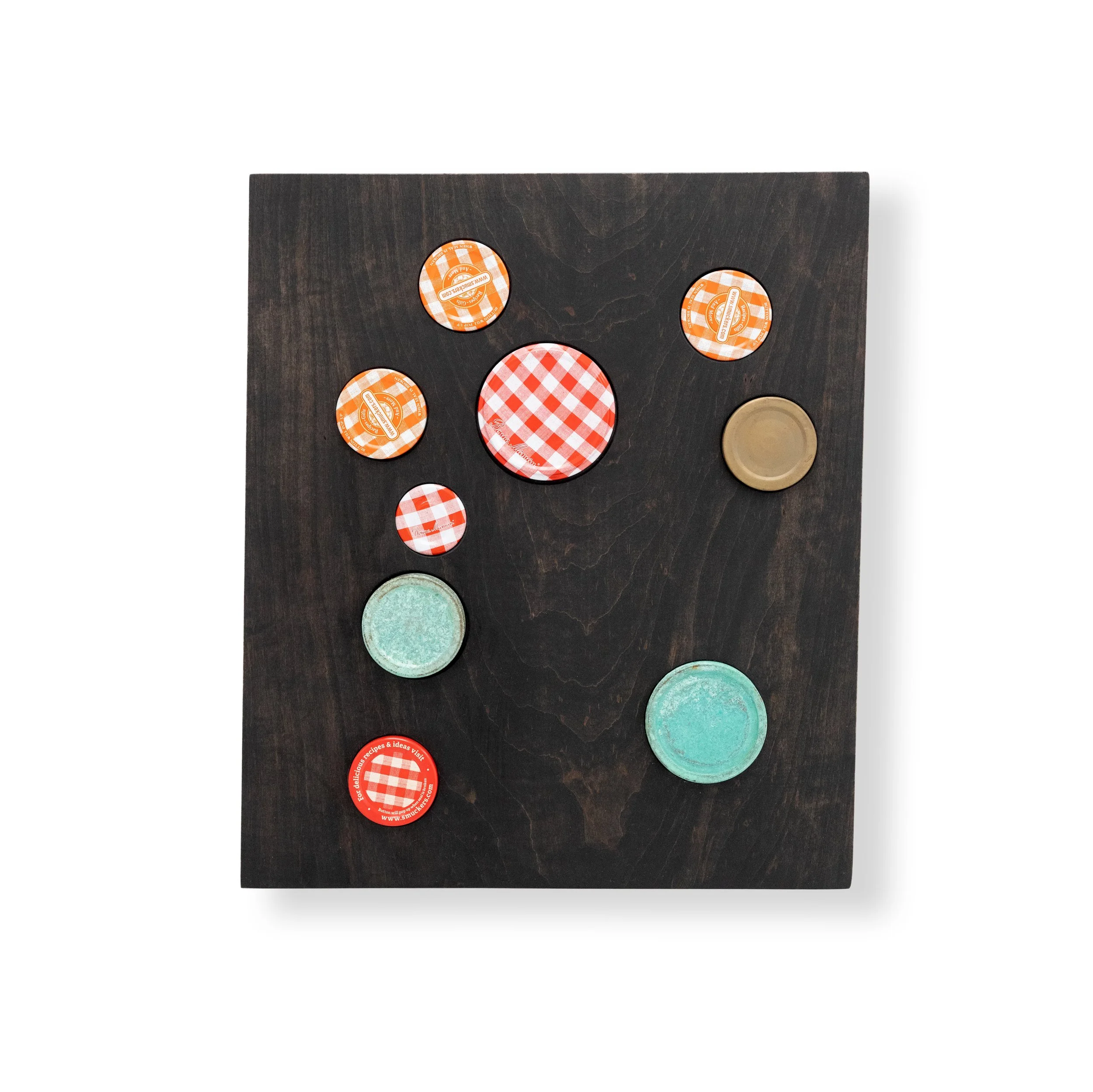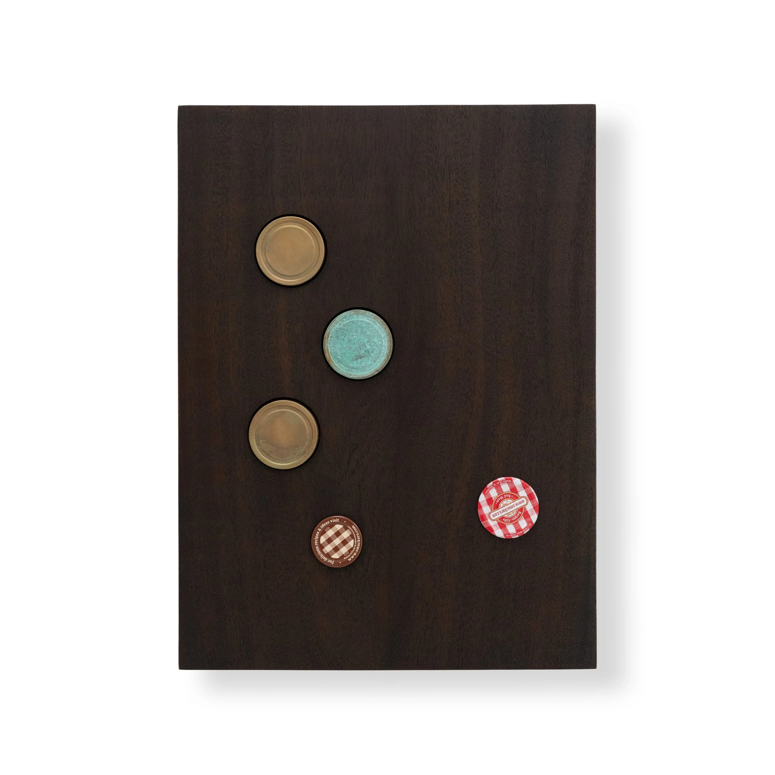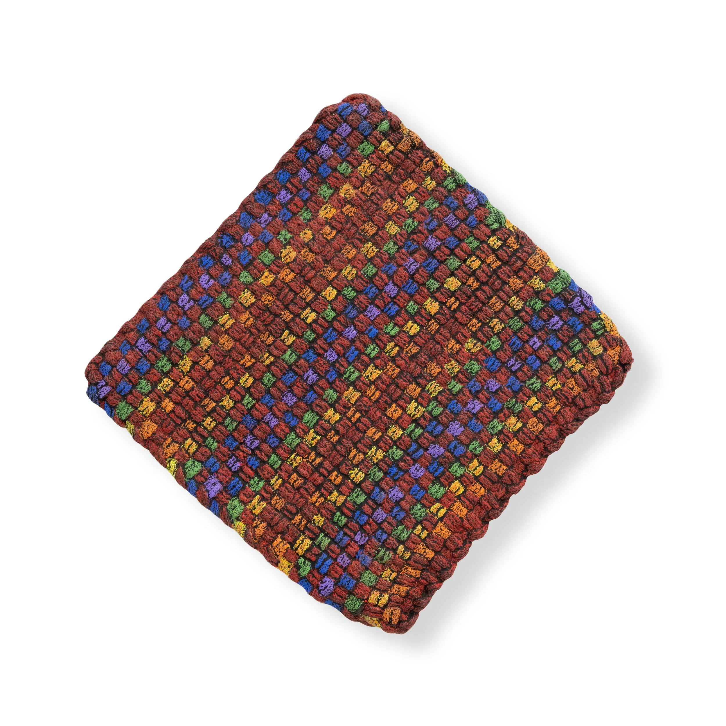 Grabner’s wall works include bronze oil painted textiles, bronze folded tablecloths, woven potholders rendered in ceramic and wooden reliefs embedded with dispersed gingham jam jar lids and bronze-cast can tops. Though differing in methods and materiality, these works are all united in their exploration of repetition and pattern, order and disorder, and guiding systems of power. Within the bronze folded tablecloths and bronze-cast textiles adorned with oil paint, the beauty and fragility of heirloom craft techniques are burnt out and replaced with the imperviousness of metal, with the application of oil paint reintroducing a sense of softness and charm. Grabner’s ceramic potholders capitalize on the artist’s ongoing investigation of craft and material augmentation as well as the grid as an ordering principle, a modernist theme, and a means for containing and organizing power. The artist’s wooden reliefs studded with jar tops and can lids play on modernist abstraction, hierarchies in materials and class, while also capitalizing on the humor that threads throughout the exhibition.