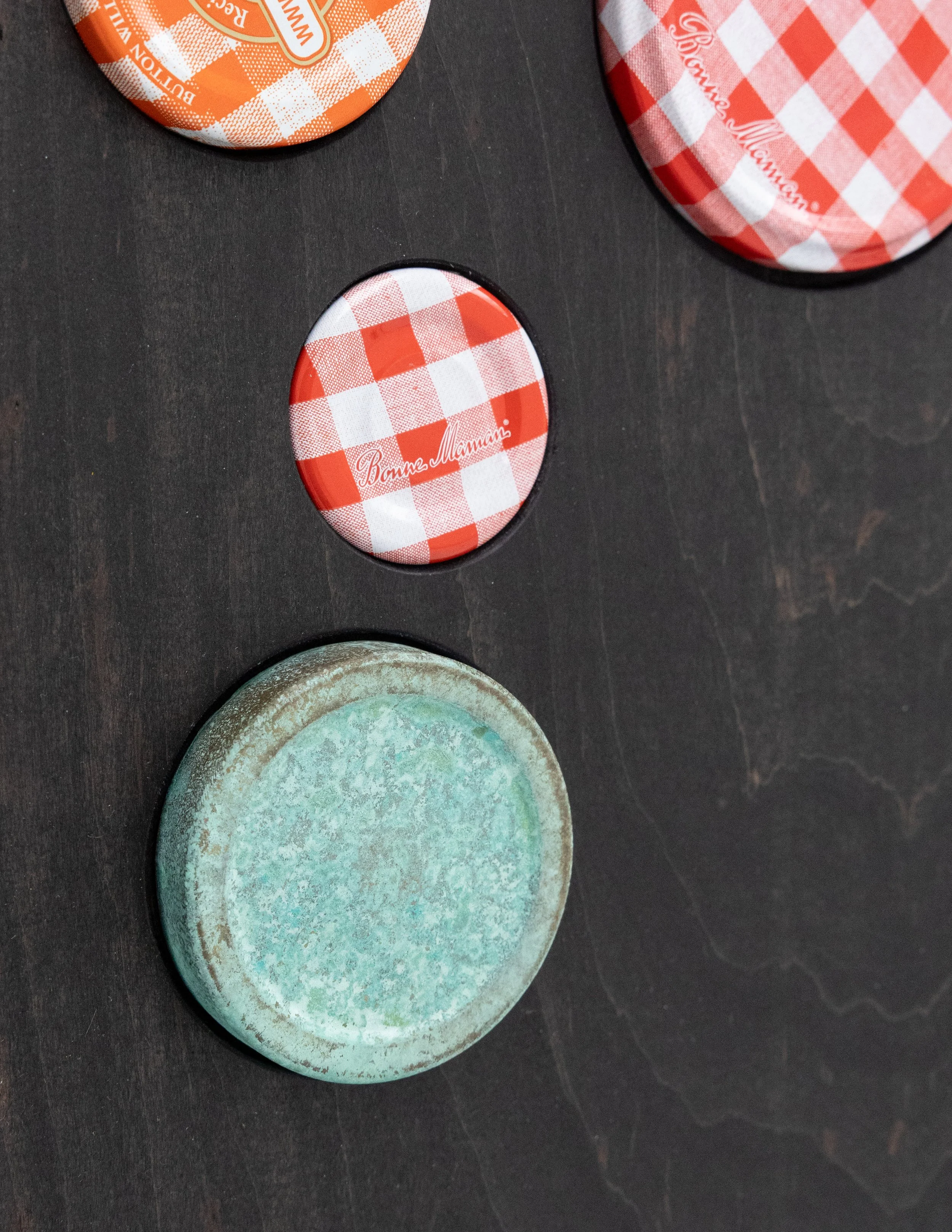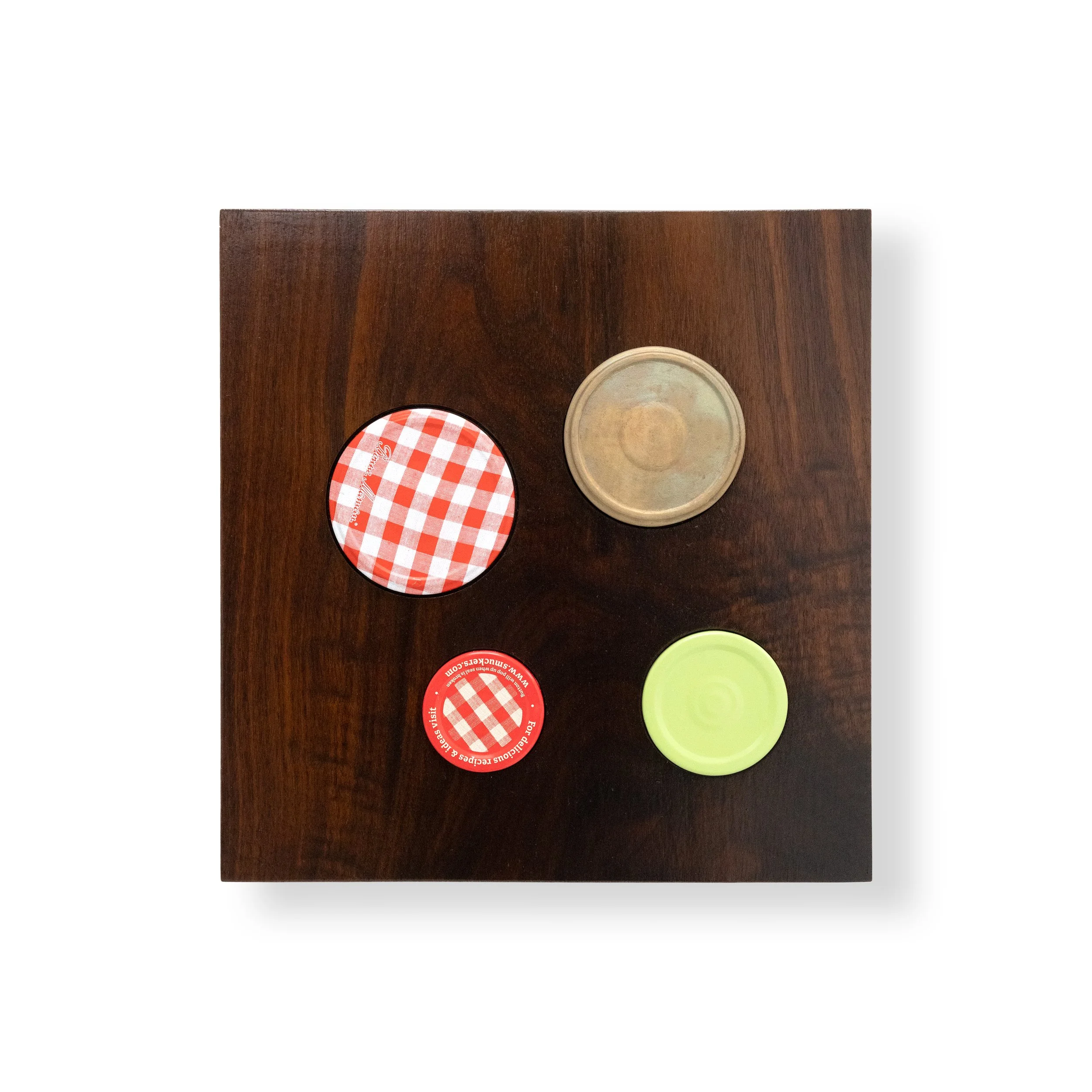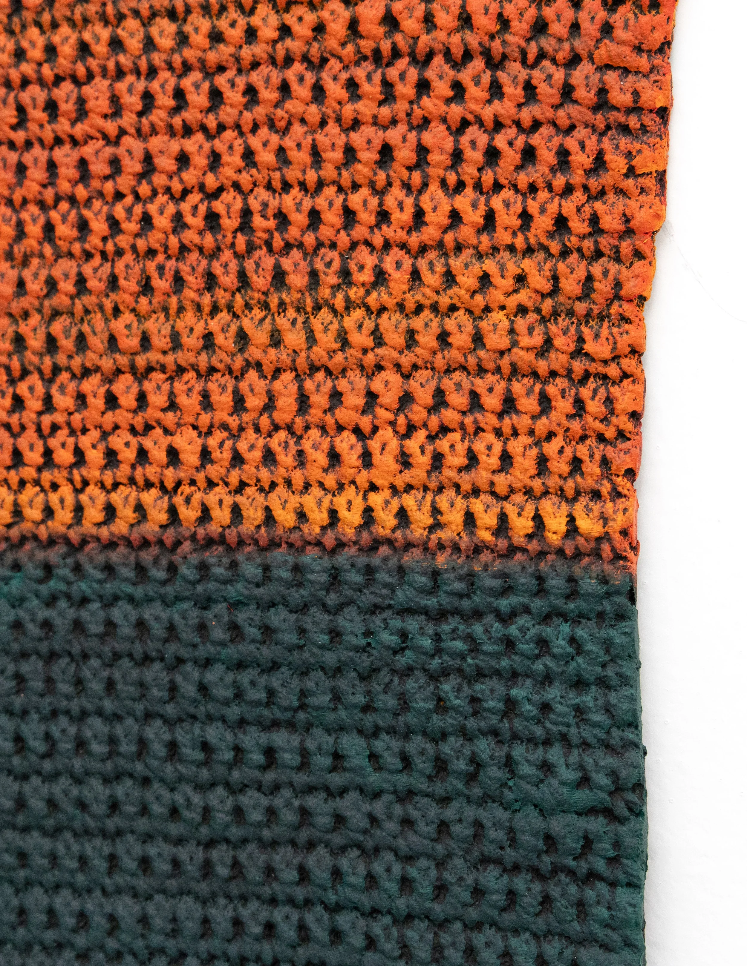 Grabner’s wall works include bronze oil painted textiles, bronze folded tablecloths, woven potholders rendered in ceramic and wooden reliefs embedded with dispersed gingham jam jar lids and bronze-cast can tops. Though differing in methods and materiality, these works are all united in their exploration of repetition and pattern, order and disorder, and guiding systems of power. Within the bronze folded tablecloths and bronze-cast textiles adorned with oil paint, the beauty and fragility of heirloom craft techniques are burnt out and replaced with the imperviousness of metal, with the application of oil paint reintroducing a sense of softness and charm. Grabner’s ceramic potholders capitalize on the artist’s ongoing investigation of craft and material augmentation as well as the grid as an ordering principle, a modernist theme, and a means for containing and organizing power. The artist’s wooden reliefs studded with jar tops and can lids play on modernist abstraction, hierarchies in materials and class, while also capitalizing on the humor that threads throughout the exhibition.